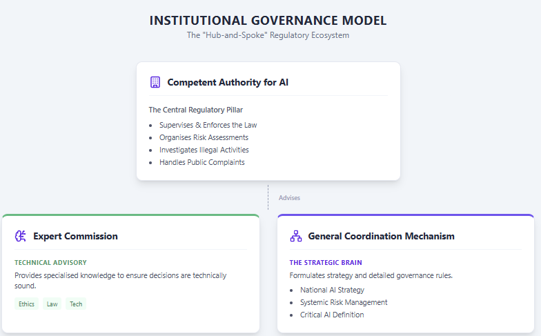 The bill will establish a new "competent authority for AI" as the central body responsible for regulating, supervising, and enforcing the law. This authority is the pillar of a multi-part governance model designed to create a flexible and informed regulatory posture. This structure avoids regulating in a vacuum; the General Coordination Mechanism (which will be led by the competent authority) acts as the strategic brain, tasked with formulating the national AI strategy, establishing systemic risk management, and creating the detailed rules for ethics, data labelling, and the governance of "Critical AI." To support this, an Expert Commission will be formed to provide the competent authority with essential technical, ethical, and legal advice, ensuring that regulatory decisions are informed by specialised, up-to-date knowledge. Finally, a "diversified coordination" approach encourages the active participation of industry organisations, academic institutions, and civil society in managing AI risks. Key functions of the competent authority include formulating technical standards, organising and reviewing risk assessments, investigating illegal activities, and handling public complaints.