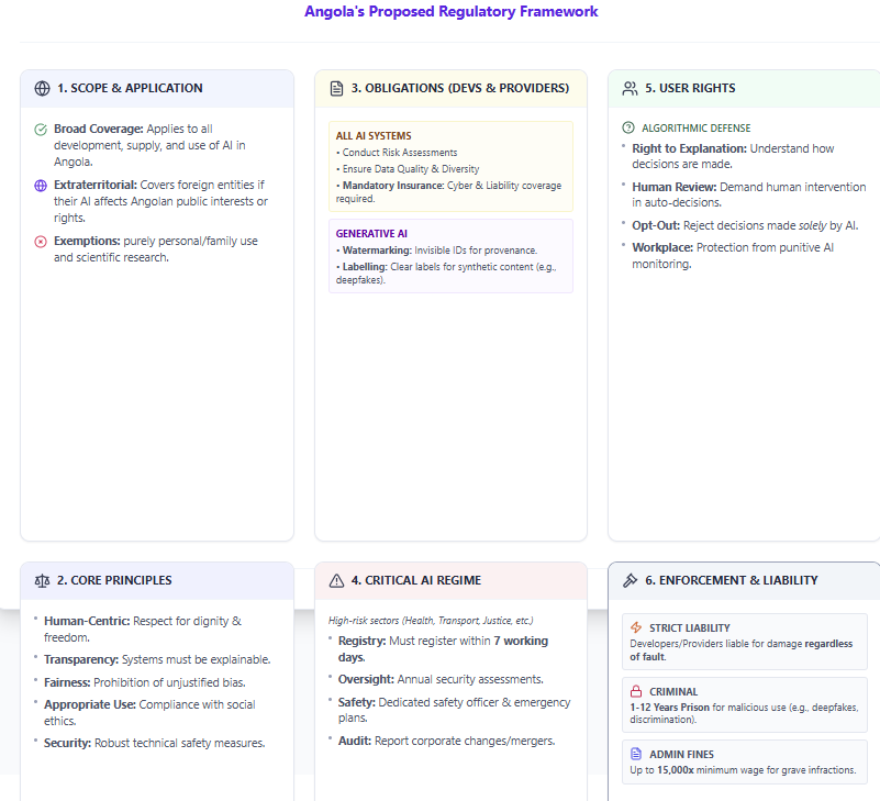 Angola's proposed AI law is one of the most comprehensive and ambitious regulatory frameworks on the African continent to date. The bill aims to establish a foundation of trust for its digital future by combining a risk-based approach with strong, centralised oversight and a novel, powerful strict liability regime. The creation of a parallel set of AI-specific rules within the revised Data Protection Act demonstrates a sophisticated, dual-pillar strategy to regulate both the technology itself and its data-driven implications. The explicit protections for users against automated decisions, the promotion of a domestic open-source ecosystem, and the imposition of severe criminal penalties for malicious use are particularly noteworthy.