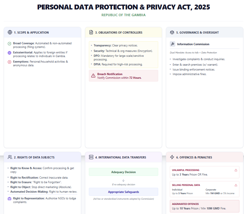 The Gambia has enacted the Personal Data Protection and Privacy Act, a landmark legislative milestone that formalises the country’s commitment to digital rights and data governance. This enactment follows the successful validation of the National Data Policy earlier in the year and marks the conclusion of a legislative process that had stalled for several years. With this development, the Gambia joins a growing list of African countries that have established robust legal frameworks to regulate the processing of personal data. The Act is comprehensive, structured around international best practices. It aims to balance the legitimate needs of government and businesses to process data with individuals' fundamental rights. Its core objectives include protecting individual privacy, ensuring lawful data processing, and establishing an independent oversight body to enforce compliance.
